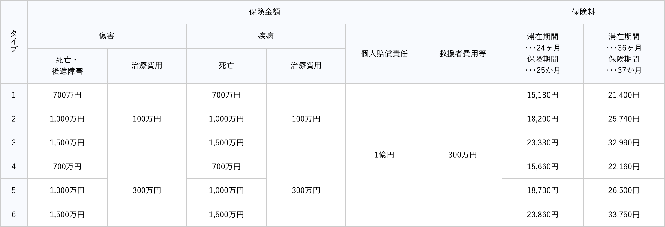 | 傷害 | 疾病 | 個人賠償責任 | 救援者費用等 | 滞在期間 ・・・24ヶ月 保険期間 ・・・25か月 |