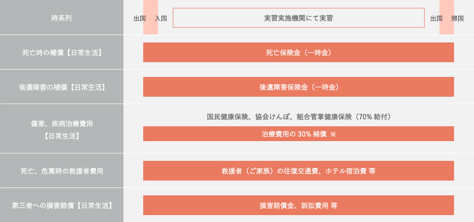 外国人技能実習生保険は、こうした公的保険では補償されない日常生活における死亡や後遺障害、ケガや病気の治療費用、第三者への賠償責任、救援者費用等を補償しています。