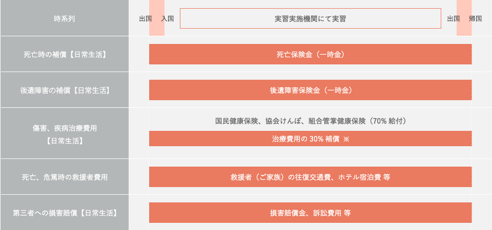 そのため技能実習生保険では、労働者災害補償法あるいは健康保険等で給付されず、受入れ機関または技能実習生が直接支払った額(自己負担額)を補償の対象としています。