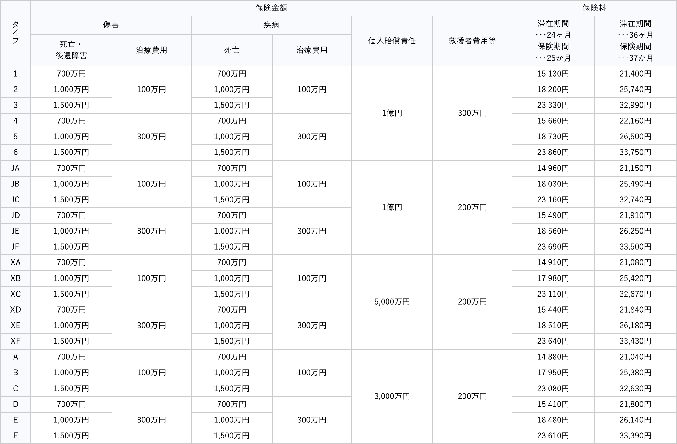 | 傷害 | 疾病 | 個人賠償責任 | 救援者費用等 | 滞在期間 ・・・24ヶ月 保険期間 ・・・25か月 |